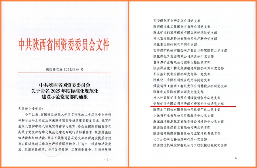 近日,陜西省國資委黨委印發(fā)了《關(guān)于命名2025年度標(biāo)準(zhǔn)化規(guī)范化建設(shè)示范黨支部的通報(bào)》,公司柴家溝井綜采隊(duì)黨支部被評為標(biāo)準(zhǔn)化規(guī)范化示范黨支部。