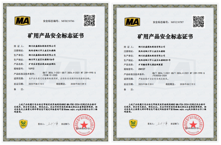 近日,銅川欣盛煤機(jī)制造有限公司成功通過了安標(biāo)國家礦用產(chǎn)品安全標(biāo)志中心評(píng)審,獲得“礦用本安型在線油液監(jiān)測安全標(biāo)志證書”和“礦用輸送帶無損監(jiān)測裝置安全標(biāo)志證書”。不僅展示了企業(yè)在煤礦安全監(jiān)測與智能化建設(shè)領(lǐng)域的技術(shù)升級(jí),更為公司進(jìn)一步拓展市場謀劃了新機(jī)遇。
