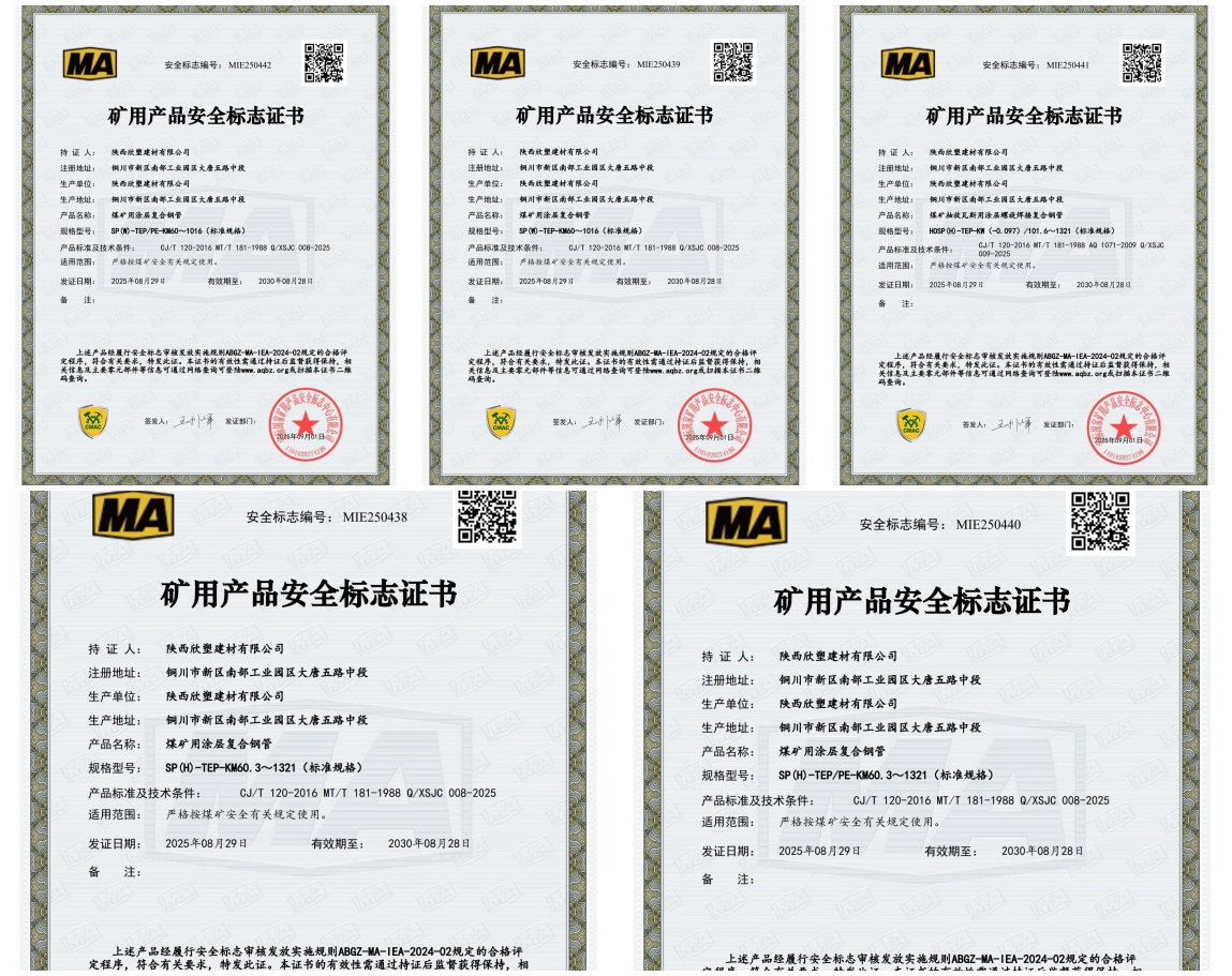 近日,欣塑公司自主研發(fā)的煤礦用涂層復合鋼管順利通過國家礦用產品安全標志認證,標志著該產品安全性能與技術指標均符合煤礦井下嚴格的使用要求,將為煤礦企業(yè)提供更加高效可靠的管道解決方案,助力井下安全生產。