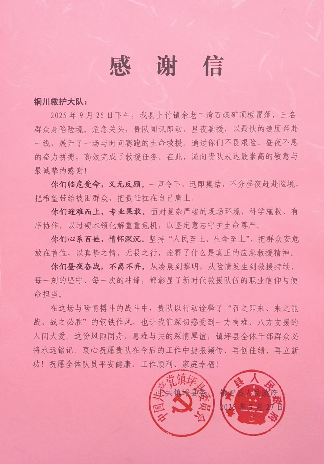 9月25日下午,陜西省安康市鎮(zhèn)坪縣余老二灣石煤礦井下檢修作業(yè)區(qū)域發(fā)生頂板事故,3名人員被困,情況危急。接到緊急救援指令的公司救護(hù)大隊迅速響應(yīng),火速集結(jié)隊伍,一路風(fēng)雨兼程奔赴事故現(xiàn)場。憑借多年的豐富經(jīng)驗、精湛的救援技術(shù)及高效協(xié)同作戰(zhàn)能力,全力推進(jìn)搜救工作,以實(shí)際行動贏得當(dāng)?shù)卣c群眾的高度贊譽(yù),并送來錦旗和感謝信,感謝公司救護(hù)大隊不畏艱難,星夜馳援,高效完成了救援任務(wù),以實(shí)際行動詮釋了該隊“召之即來、來之能戰(zhàn)、戰(zhàn)之必勝”的鋼鐵作風(fēng)和責(zé)任擔(dān)當(dāng)。