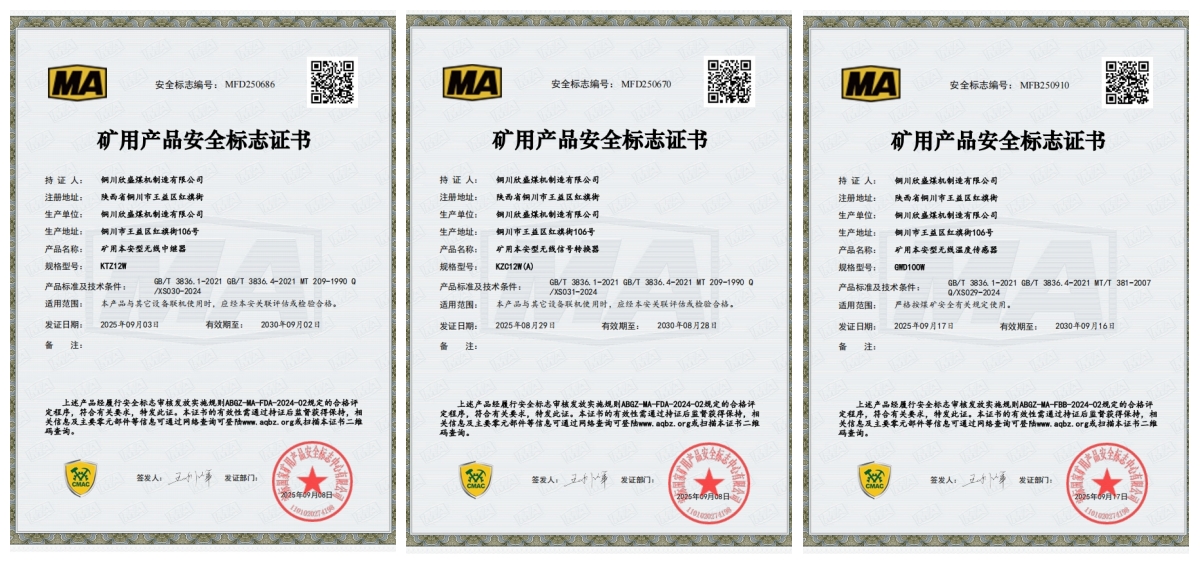 近日,銅川欣盛煤機公司合作研發(fā)的采空區(qū)無線火災預警系統(tǒng)順利通過國家礦用產品安全標志認證并頒發(fā)證書。該系統(tǒng)包含礦用本安型無線信號轉換器、礦用本安型無線溫度傳感器和礦用本安型無線中繼器共三款核心產品,標志著該技術已具備全面推廣與井下應用條件,為煤礦企業(yè)采空區(qū)防滅火工作提供新的解決方案。