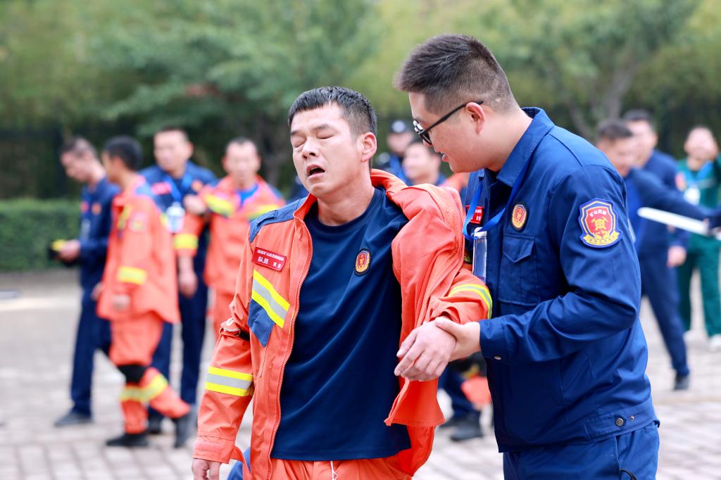 當(dāng)日上午和接下來的兩天,綜合技能競賽現(xiàn)場,高空攀繩、剪切破拆、匍匐過矮巷、蓄力翻輪胎、協(xié)調(diào)身姿過曲橋、扛著重物坡道運物料、連續(xù)作業(yè)拋重物、瞄準(zhǔn)尺寸鋸木料等一項項的競技比拼不斷上演,以上項目必須在8分鐘之內(nèi),按要求時間完成,這些項目對參賽隊員的體能、耐力是近乎接近“體能極限”的考驗,項目超時將扣分,超過10分鐘將被終止比賽。許多參賽隊員完成項目時已是大汗淋漓,有的已疲憊不堪,需要近旁的人員攙扶著走向休息區(qū)域。
