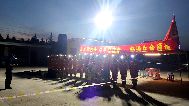 涼風(fēng)習(xí)習(xí),隊旗烈烈。20時許,一陣緊急的警鈴劃破了傍晚的寧靜,值備班指戰(zhàn)員迅速集合,指揮車、運兵車、照明發(fā)電車、裝備車警燈閃爍,警報長鳴。“ 某廠1工人墜落蓄水池,搜尋未果,召請我隊緊急前往救援......”隨著指揮員命令下達,20余名指戰(zhàn)員迅速登車出動,這是公司救護大隊6月5日排水搶險救援演練的一幕。