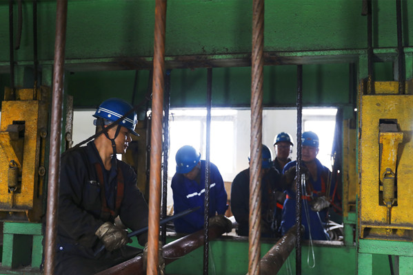 施工過程中,安全管理人員全程緊盯現(xiàn)場,作業(yè)區(qū)域拉設警戒線,井底施工人員在罐籠頂部安裝分繩器,罐籠平穩(wěn)停至指定位置后,搭建鋼梁穩(wěn)固支撐,并借助拉運裝置,應用快速提罐設備,緊密協(xié)同配合,大幅縮短提升時間。在平臺的施工人員精準安裝自動鎖繩裝置,上下實施新、舊繩頭搭接、拆除舊懸掛裝置等操作。業(yè)務部門嚴格按照質(zhì)量標準要求,做到每道工序、每個環(huán)節(jié)驗收,提供技術指導,確保施工作業(yè)安全有序。
