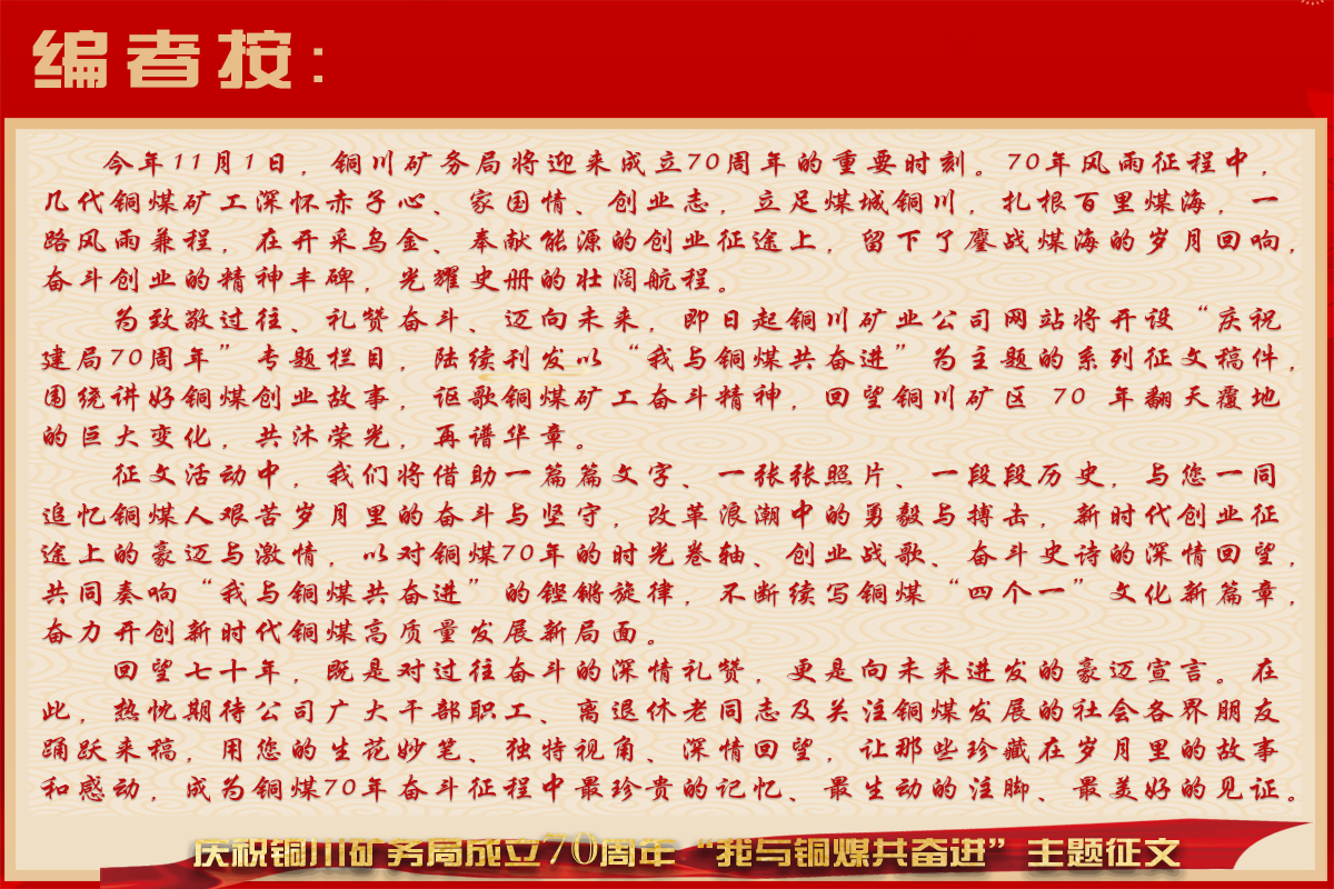 當(dāng)時(shí)光的年輪行進(jìn)到2025年,位于三秦大地、煤城銅川這方創(chuàng)業(yè)熱土上的銅川礦業(yè),也將迎來企業(yè)成立70周年的日子。在七秩春秋的奮斗中,幾代銅煤礦工把“能源報(bào)國、服務(wù)社會(huì)”的初心匯成礦區(qū)的光影記憶,把“開采烏金、奉獻(xiàn)光熱”的誓言鍛造成創(chuàng)業(yè)奮戰(zhàn)的鋼鐵脊梁,以一曲巍然挺立于渭北黑腰帶上的奮斗長歌,講述著屬于銅煤人的創(chuàng)業(yè)故事和動(dòng)人史詩。